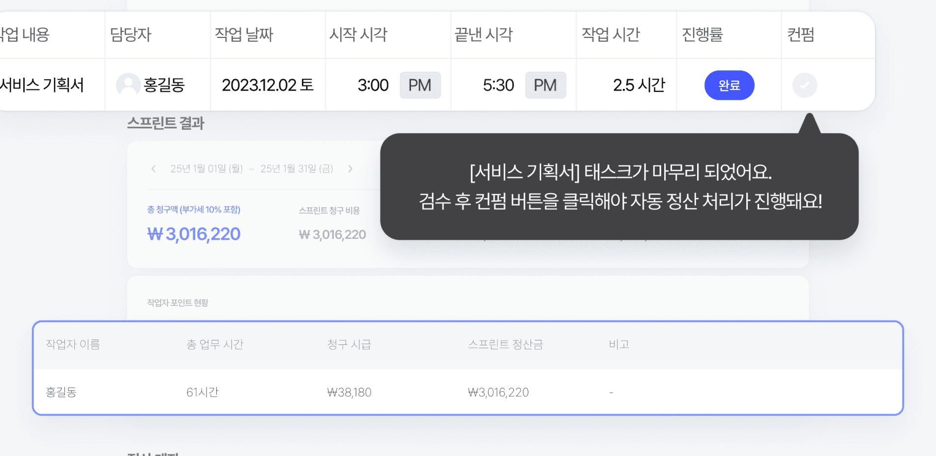 기여도와 유휴율까지 직접 확인하고 컨펌할 수 있습니다.