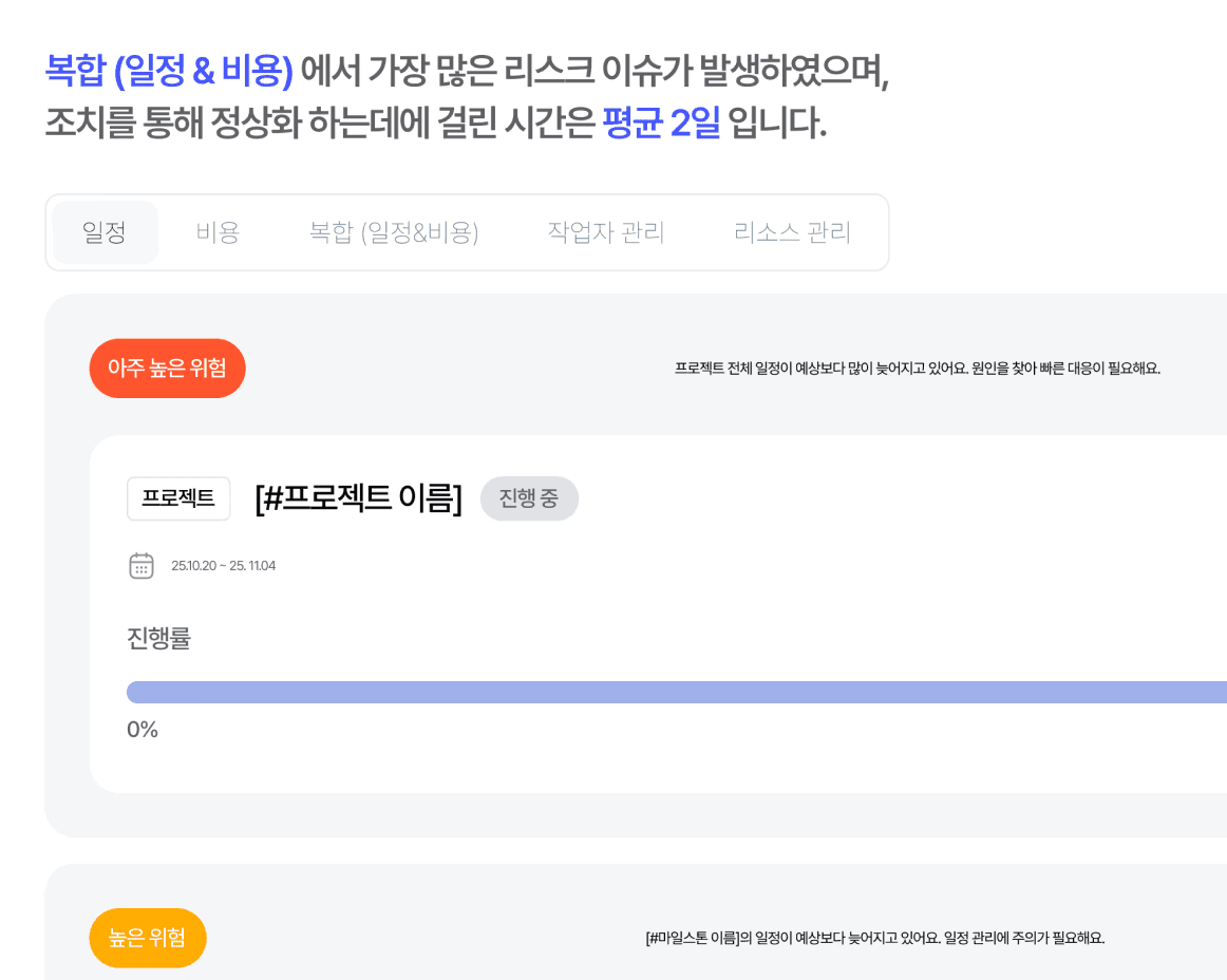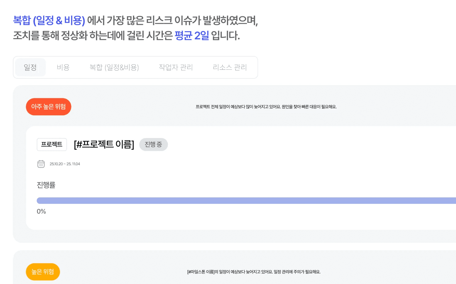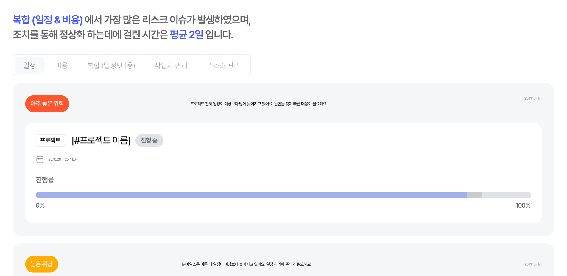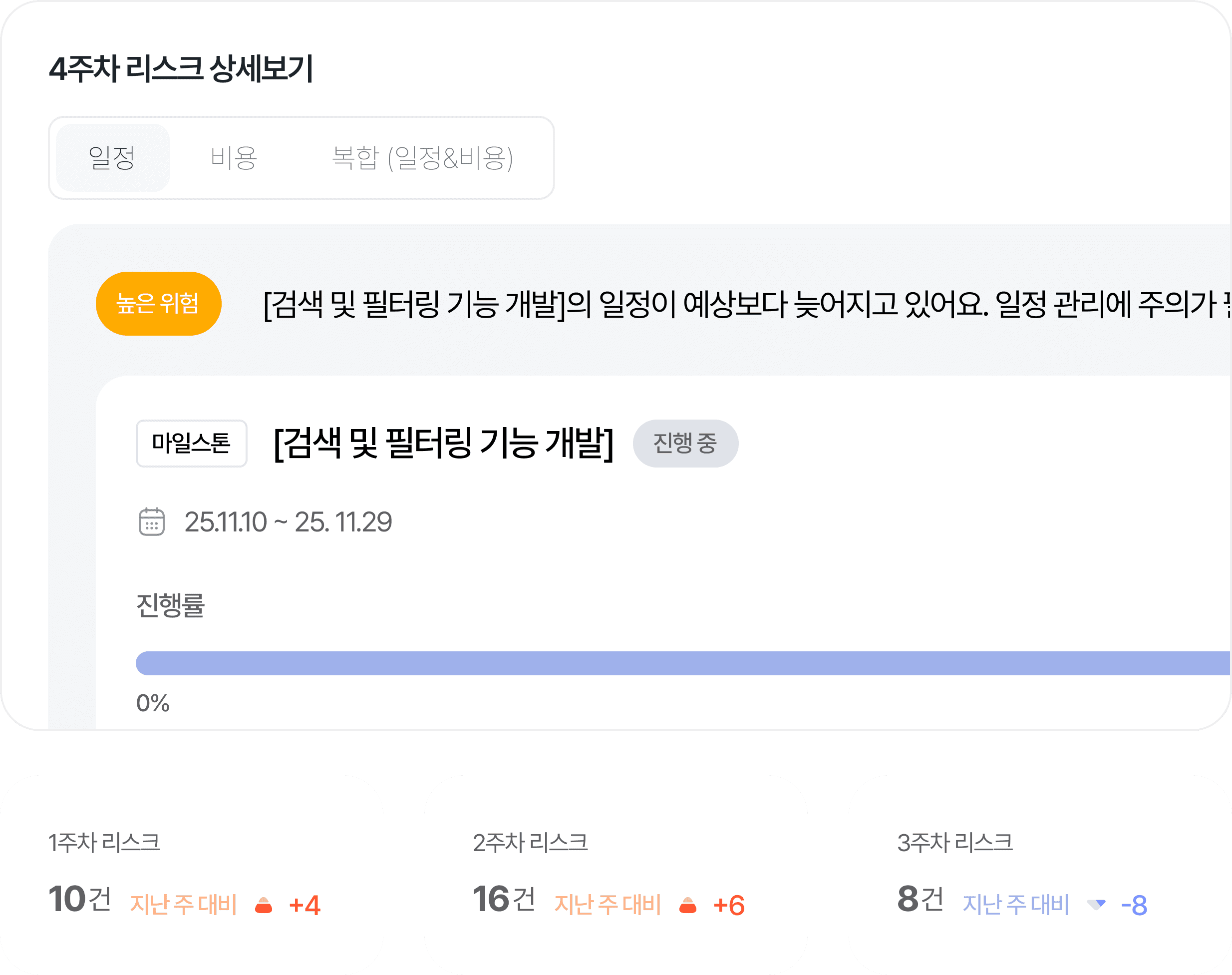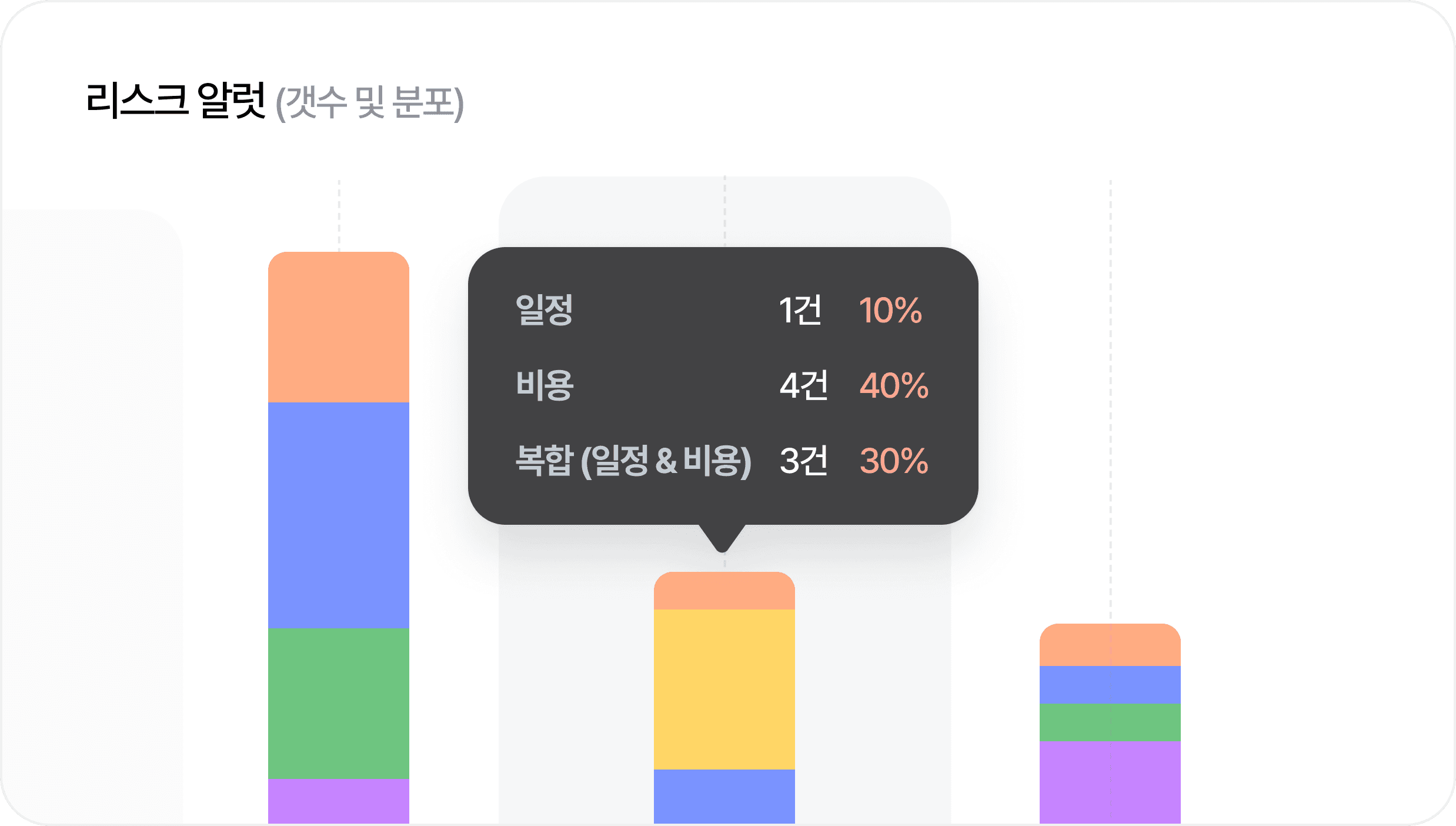 단순한 리스크 전달을 넘어 다년간 쌓인 프로젝트 관리 노하우를 바탕으로 리스크의 예상 원인 및 대응 방안을 제공합니다.